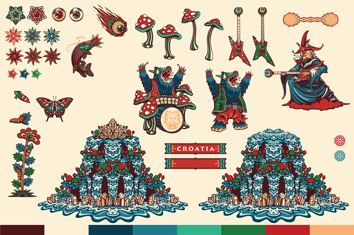 I was invited by Marin Lalić, CEO of Bear Stone Festival to make a new illustration for the 2026 edition of this incredible psychedelic rock festival from Croatia. For the client is important to have all the characters separated and fully drawn so they can be used for other designs, like stage design, beer labels and etc. It was also asked by the client to have the illustration fully rendered as vectors so they can be used in various sizes.