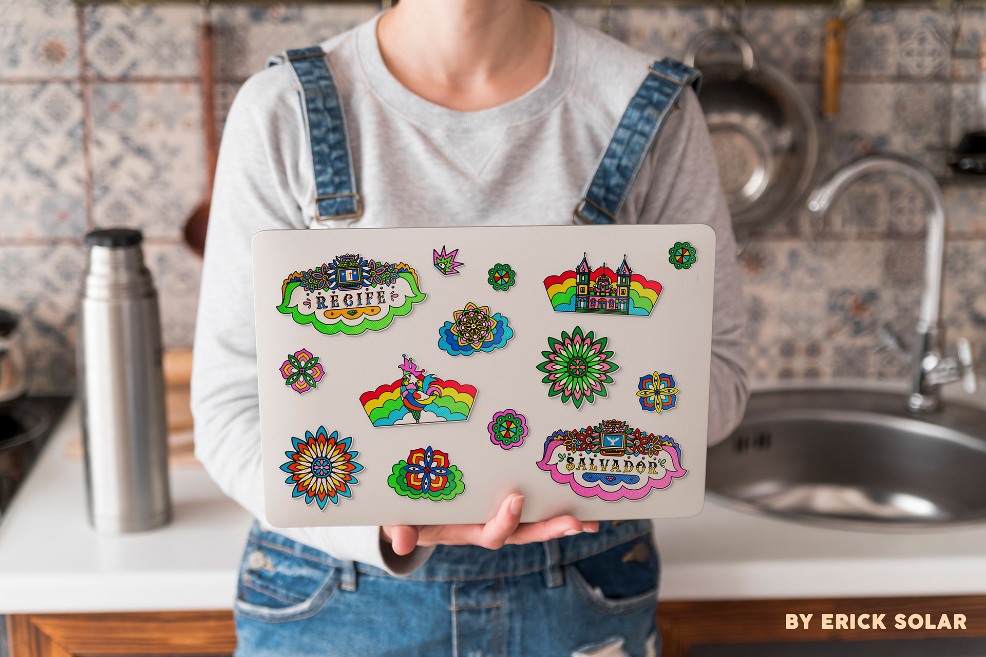 Taking advantage of the range of possibilities due to the style I developed inspired by collages and stickers, I created pieces that explore different applications of the same illustration.