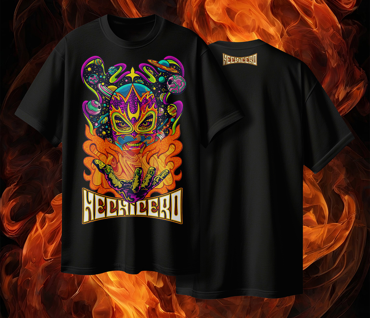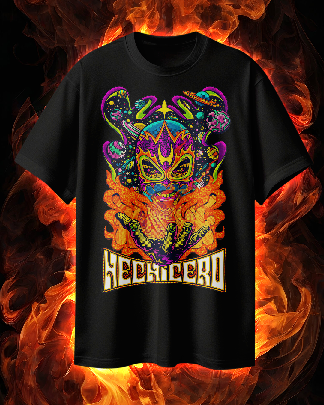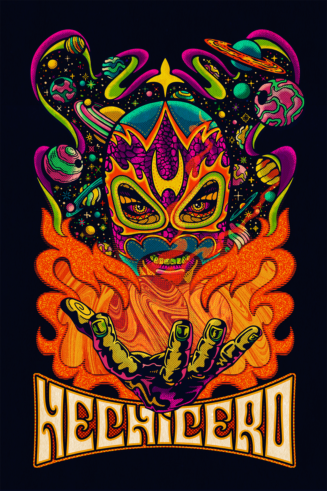 In this artwork I bring my personal style to convey the feeling of watching Hechicero dominating the ring and his opponents, like a cosmic entity that holds the world in his hands and loves the thriling of the action.