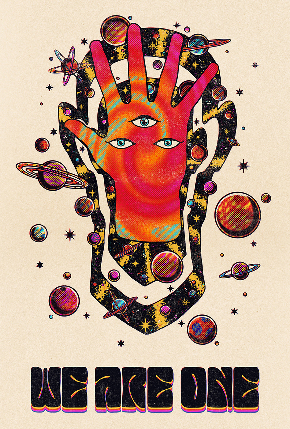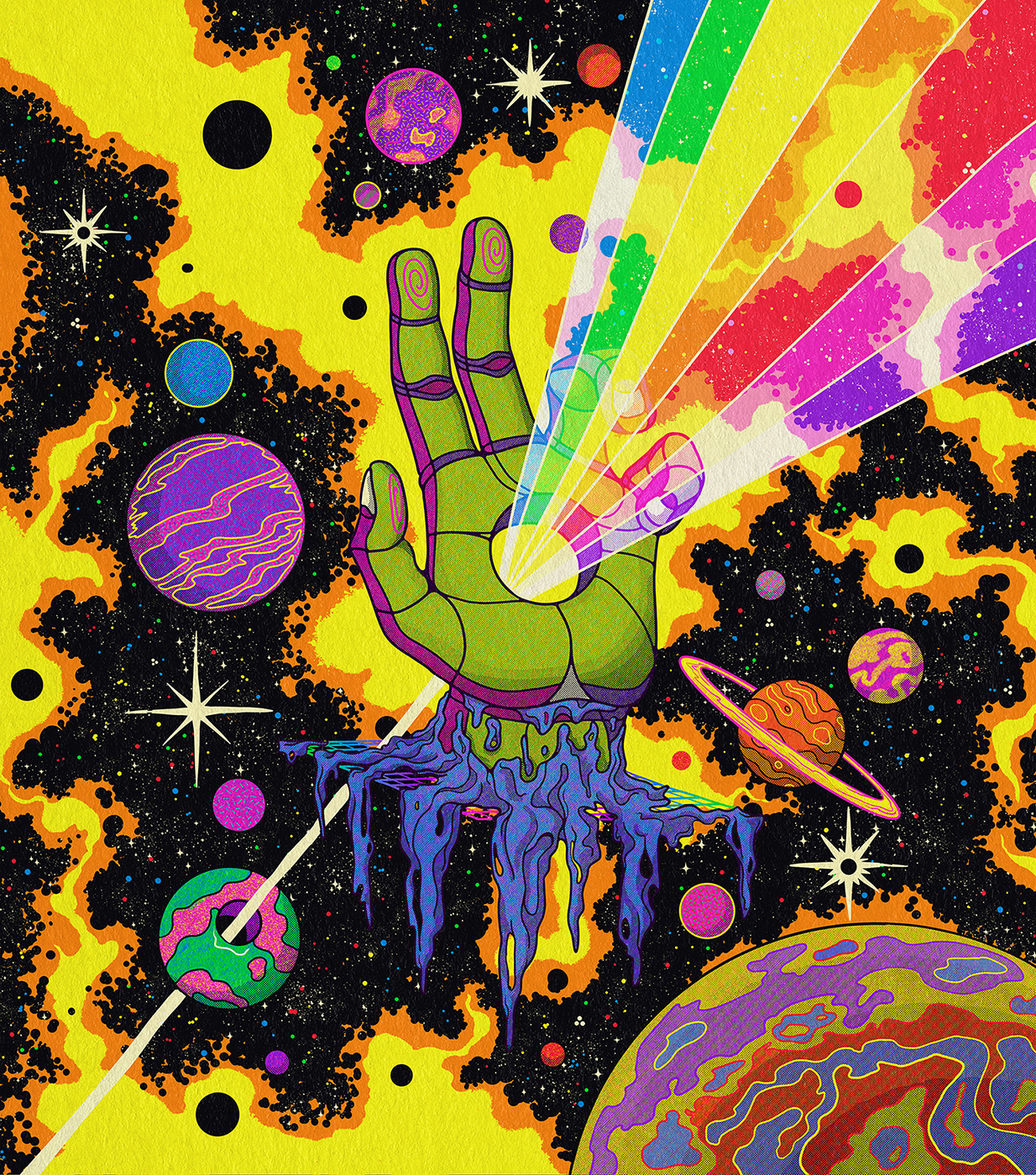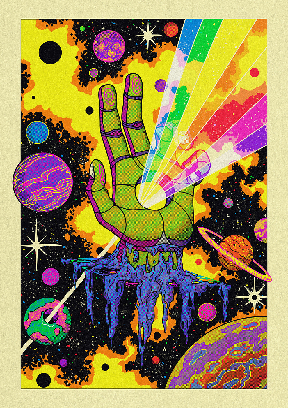 These are personal artworks that I made since I decided to be a professional illustrator. You can see that I love to draw hands, eyes and the space, mixed with lots of colors in a vintage psychedelic style.
