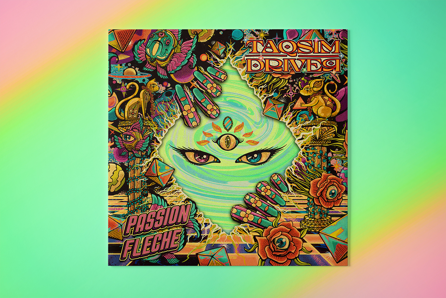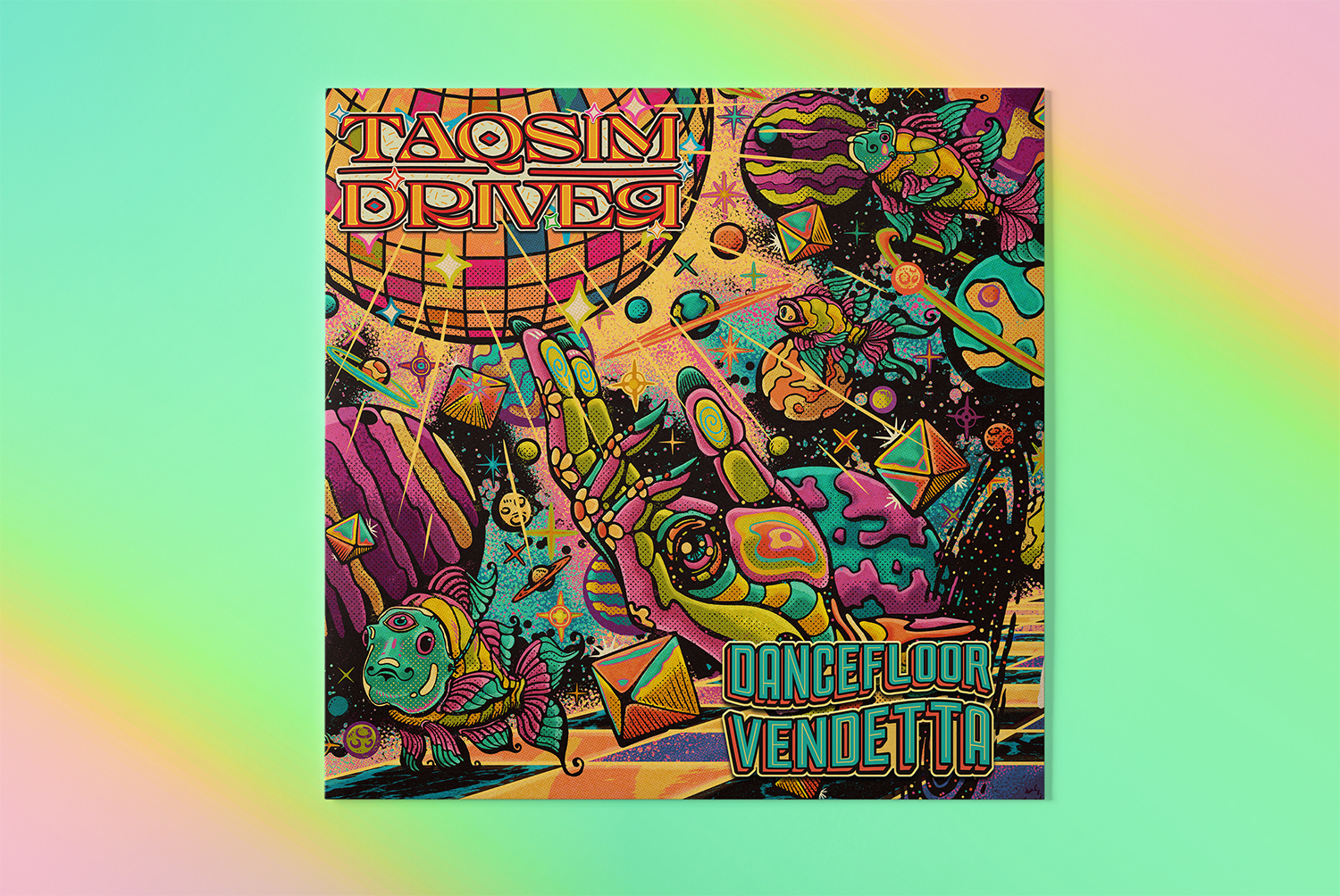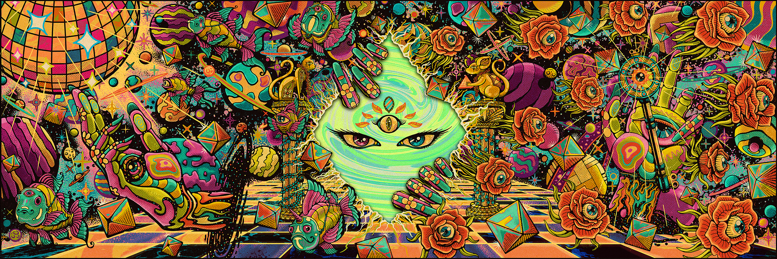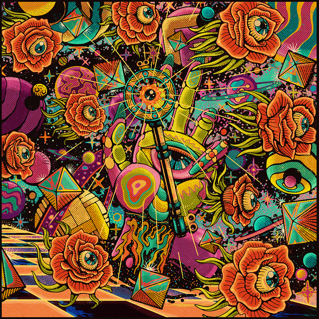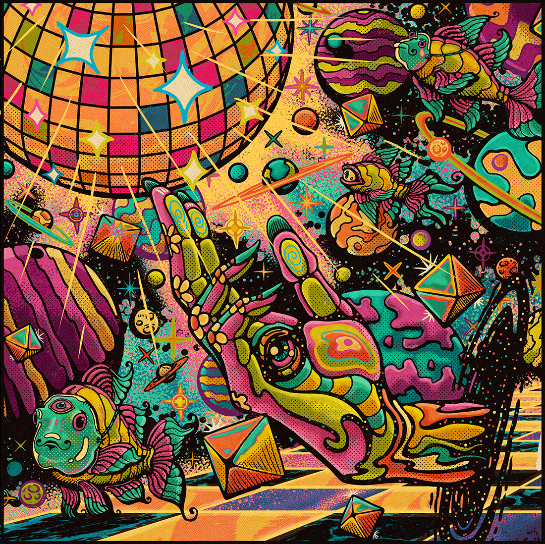 The idea was to make a vintage psychedelic cosmic art that tells the story behind all three songs combined in one single illustration.
