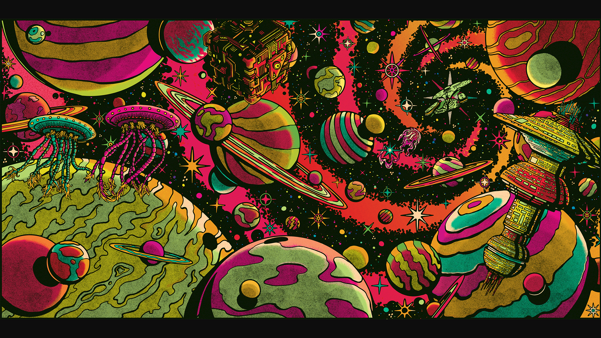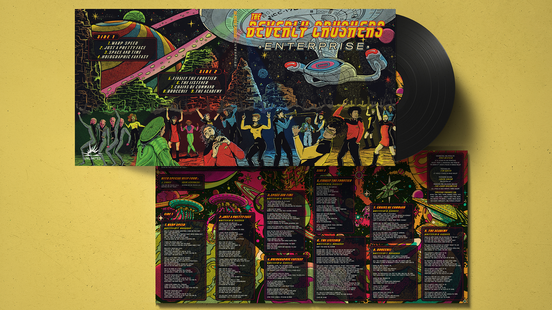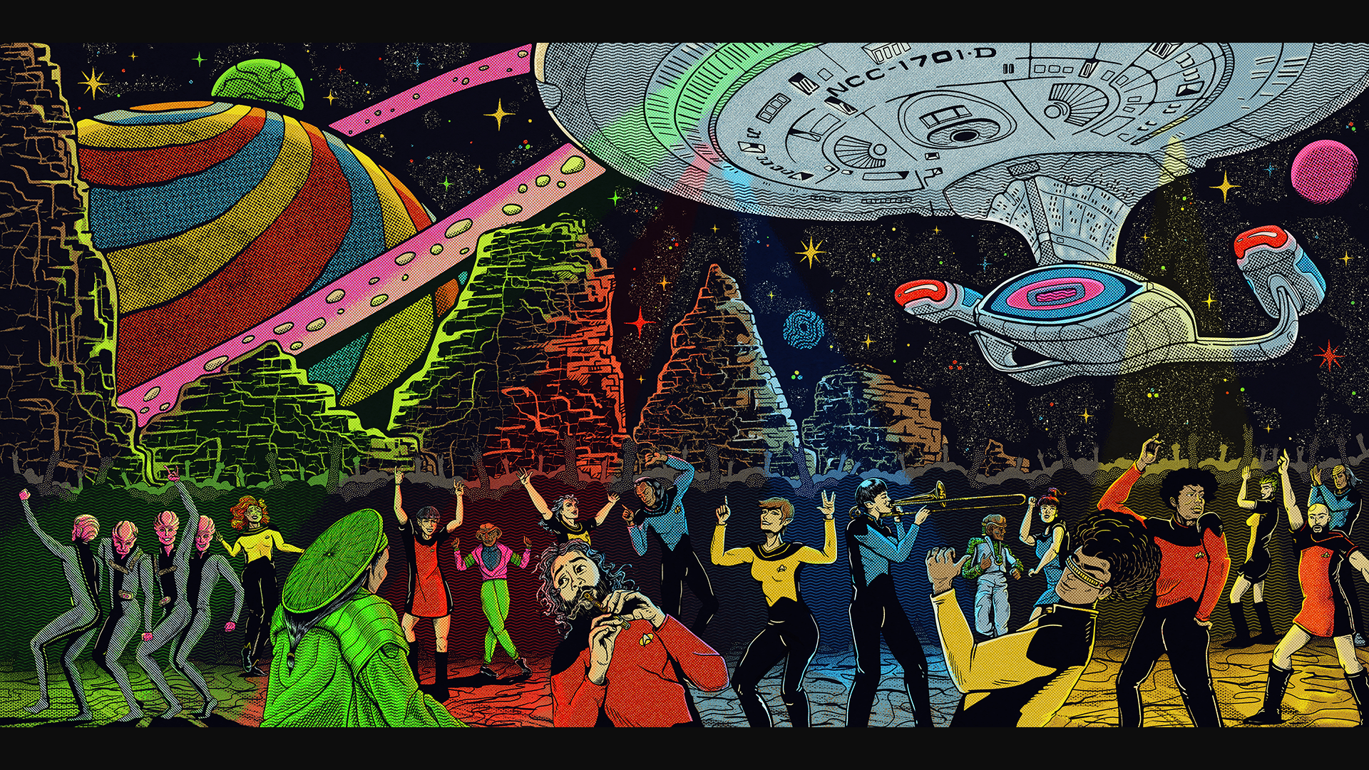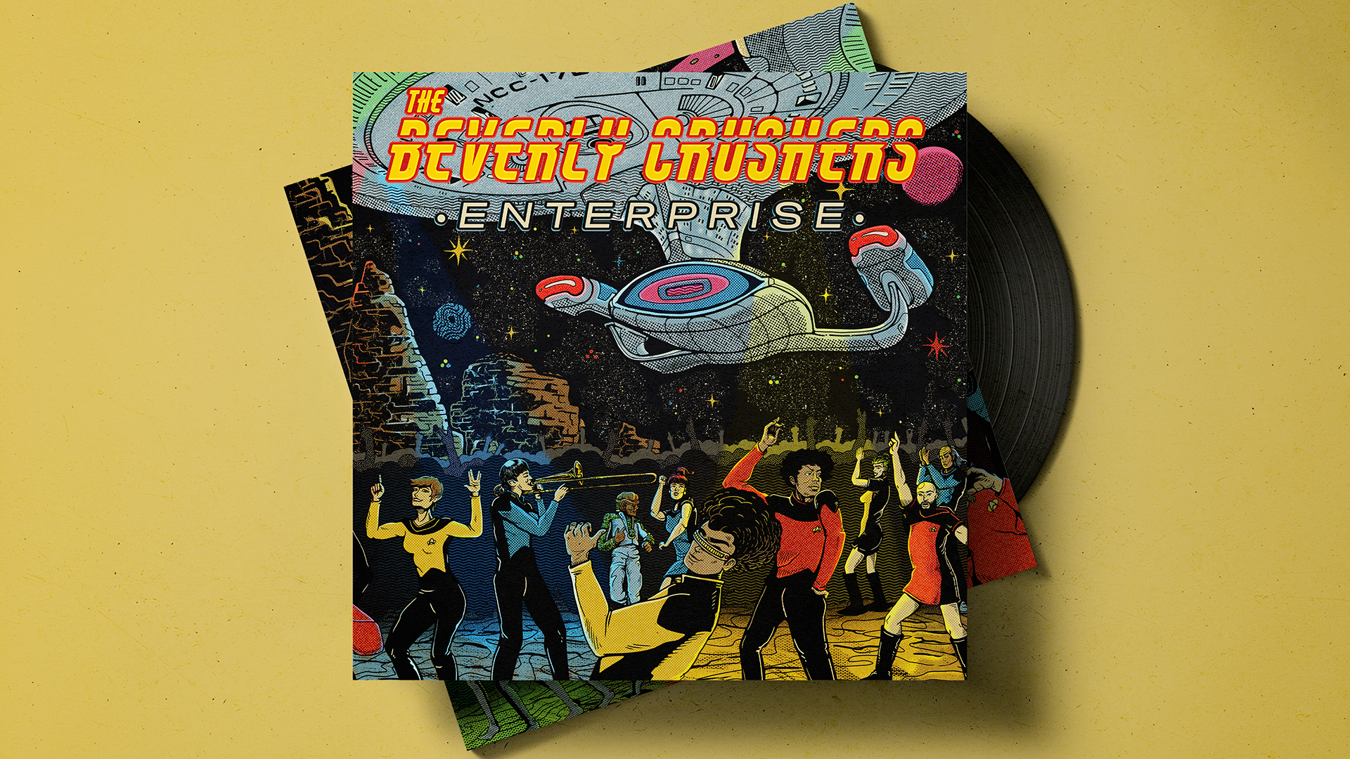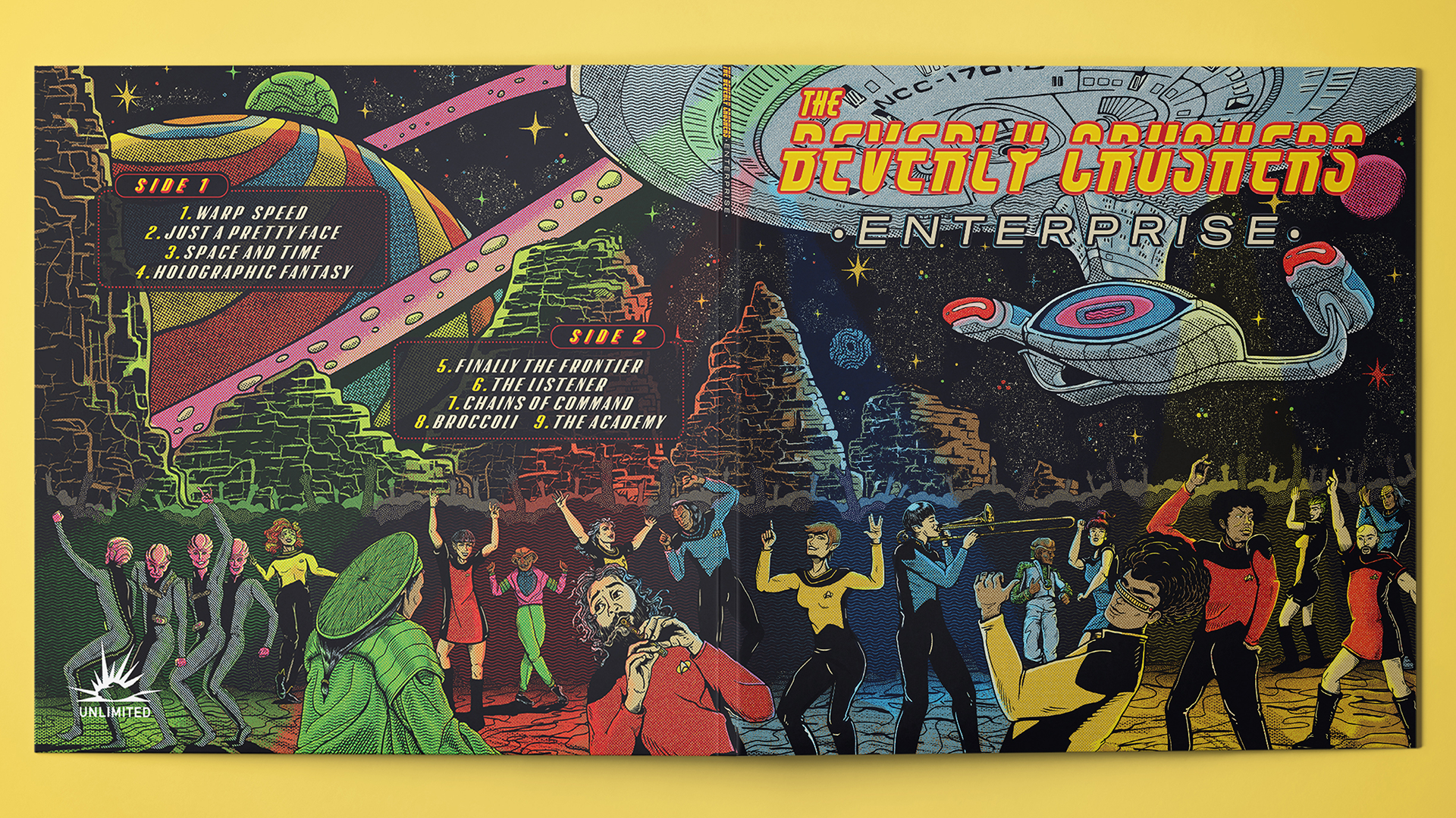 The challenge was to create an illustration that brought the band's theme (Star Trek: The Next Generation) in a vintage, vibrant and psychedelic style that matches the band's sound.