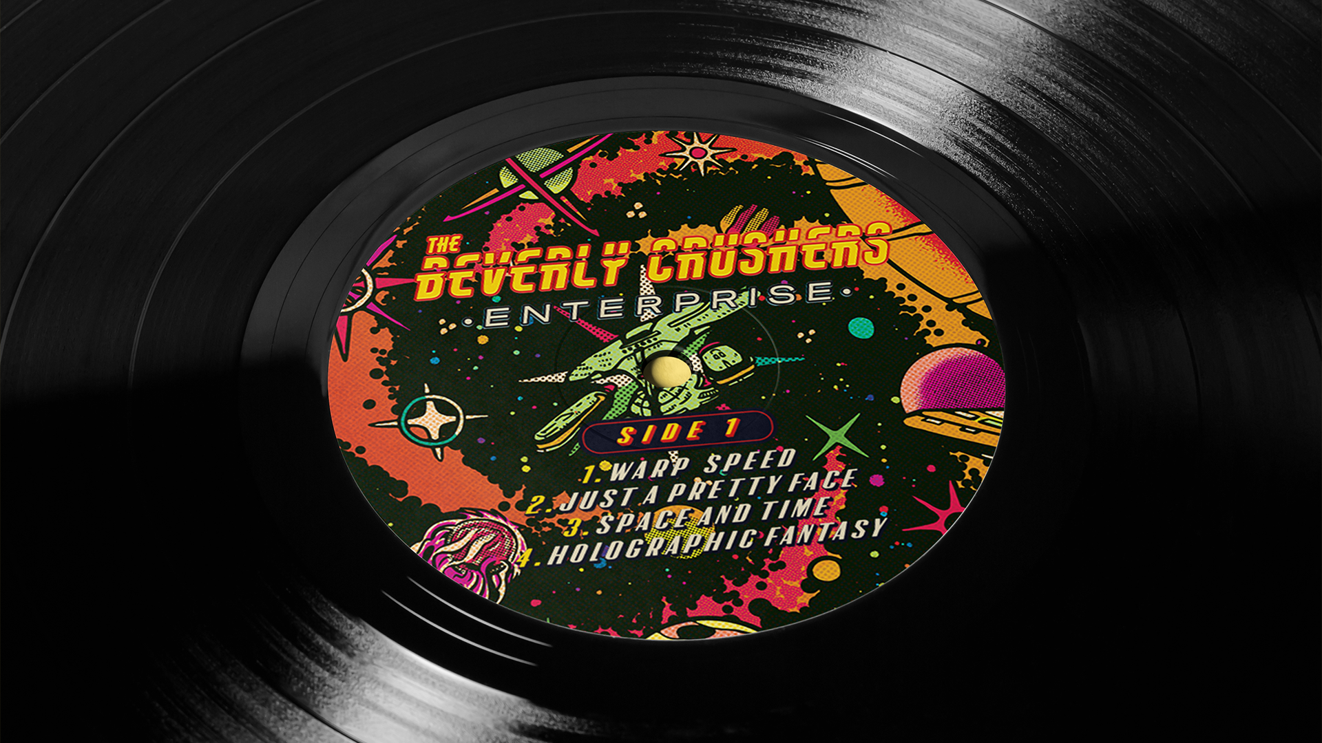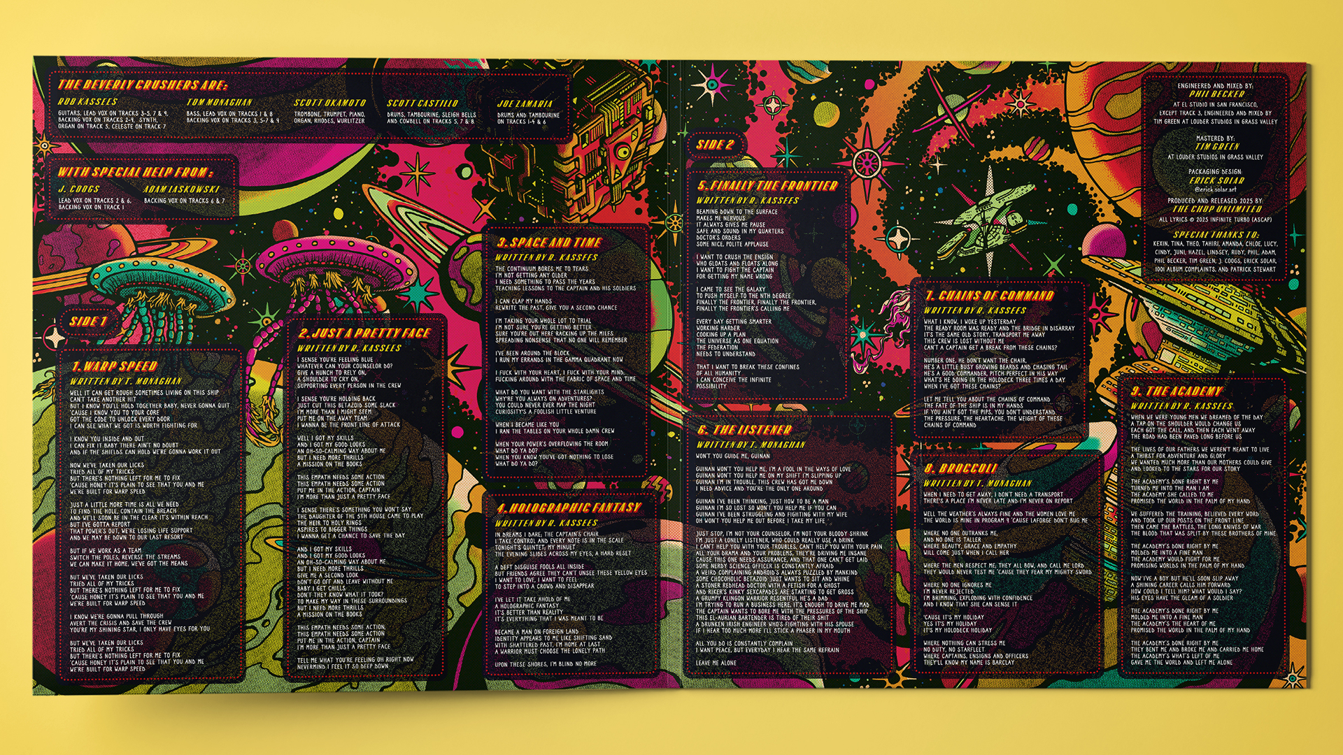 I was invited by Robert to illustrate the cover of the 2025 album from the band The Beverly Crushers: Enterprise. The Crushers mix genres like classic rock, funk and hip hop to create a danceable, fun variety of a record.